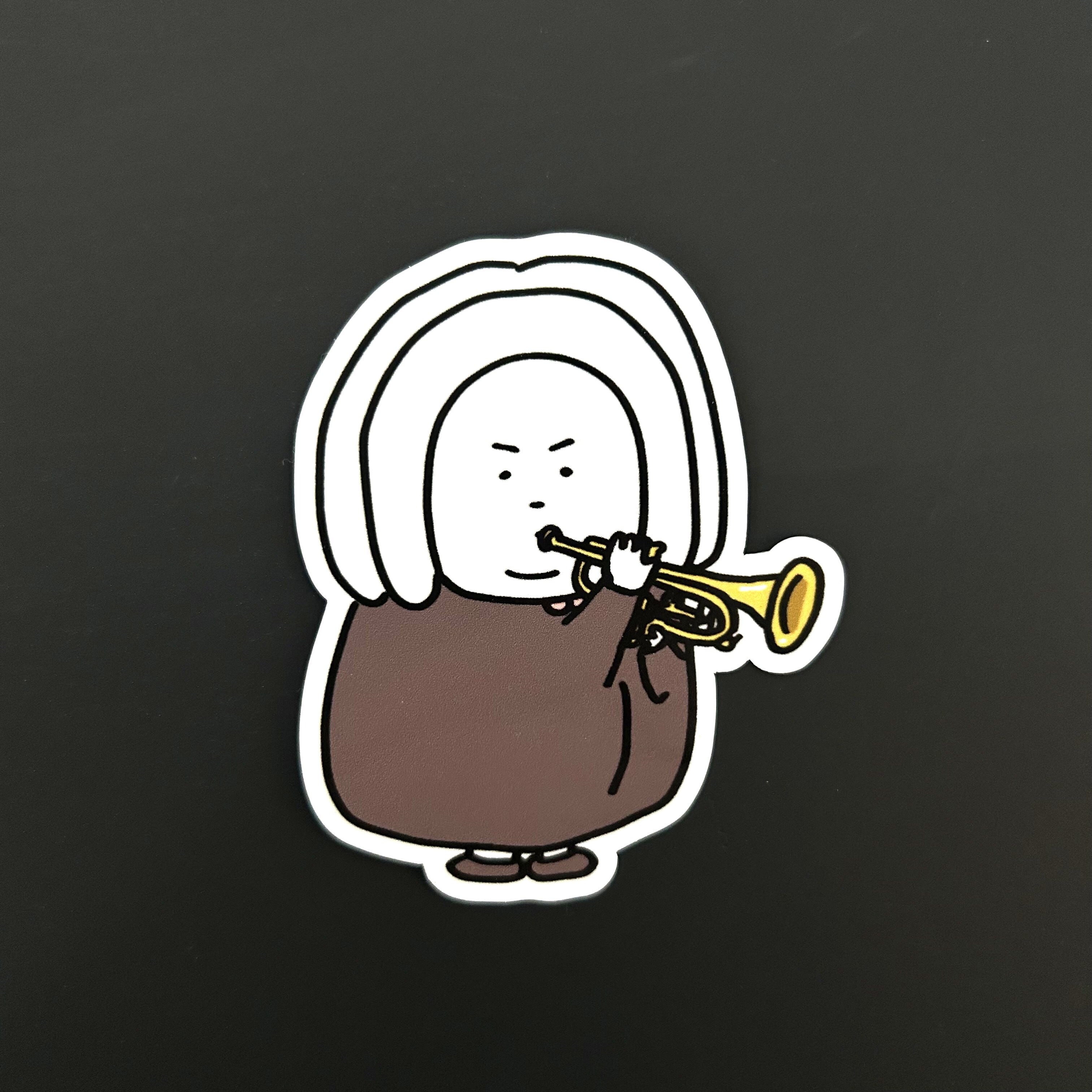 きりっとした表情でトランペットを吹くバッハくんのステッカー。